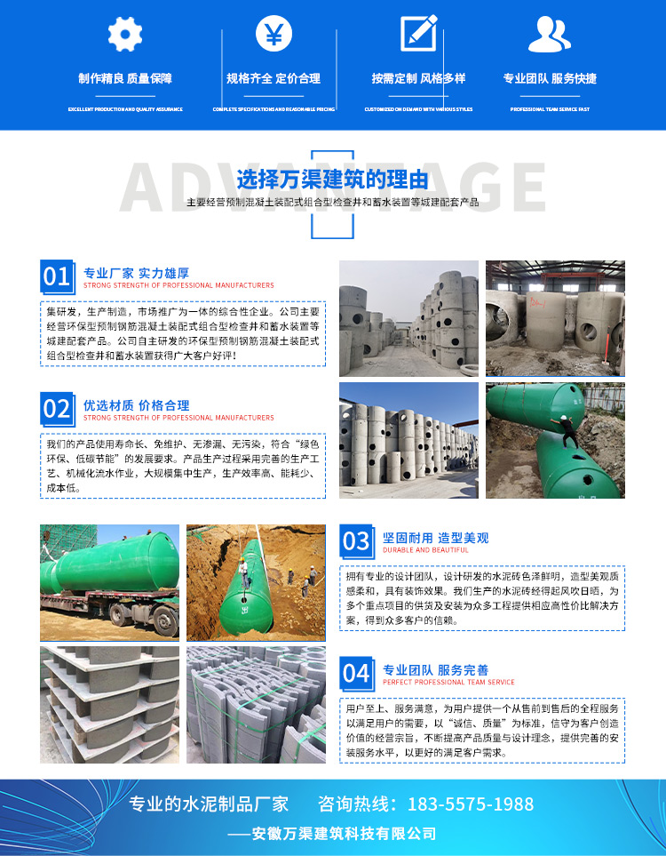 安徽萬渠建筑科技有限公司是集研發(fā),生產(chǎn)制造,市場(chǎng)推廣為一體的綜合性企業(yè)。公司主要經(jīng)營(yíng)環(huán)保型預(yù)制鋼筋混凝土裝配式組合型檢查井和蓄水裝置等城建配套產(chǎn)品。產(chǎn)品生產(chǎn)過程采用獨(dú)特的生產(chǎn)工藝,機(jī)械化流水作業(yè)。產(chǎn)品大規(guī)模生產(chǎn),生產(chǎn)效率高,耗能少,成本低,產(chǎn)品使用壽命長(zhǎng)、免維護(hù)、無滲漏、無污染,符合“綠色環(huán)保,低碳節(jié)能”的發(fā)展要求,是傳統(tǒng)磚砌井池的理想替代產(chǎn)品。
